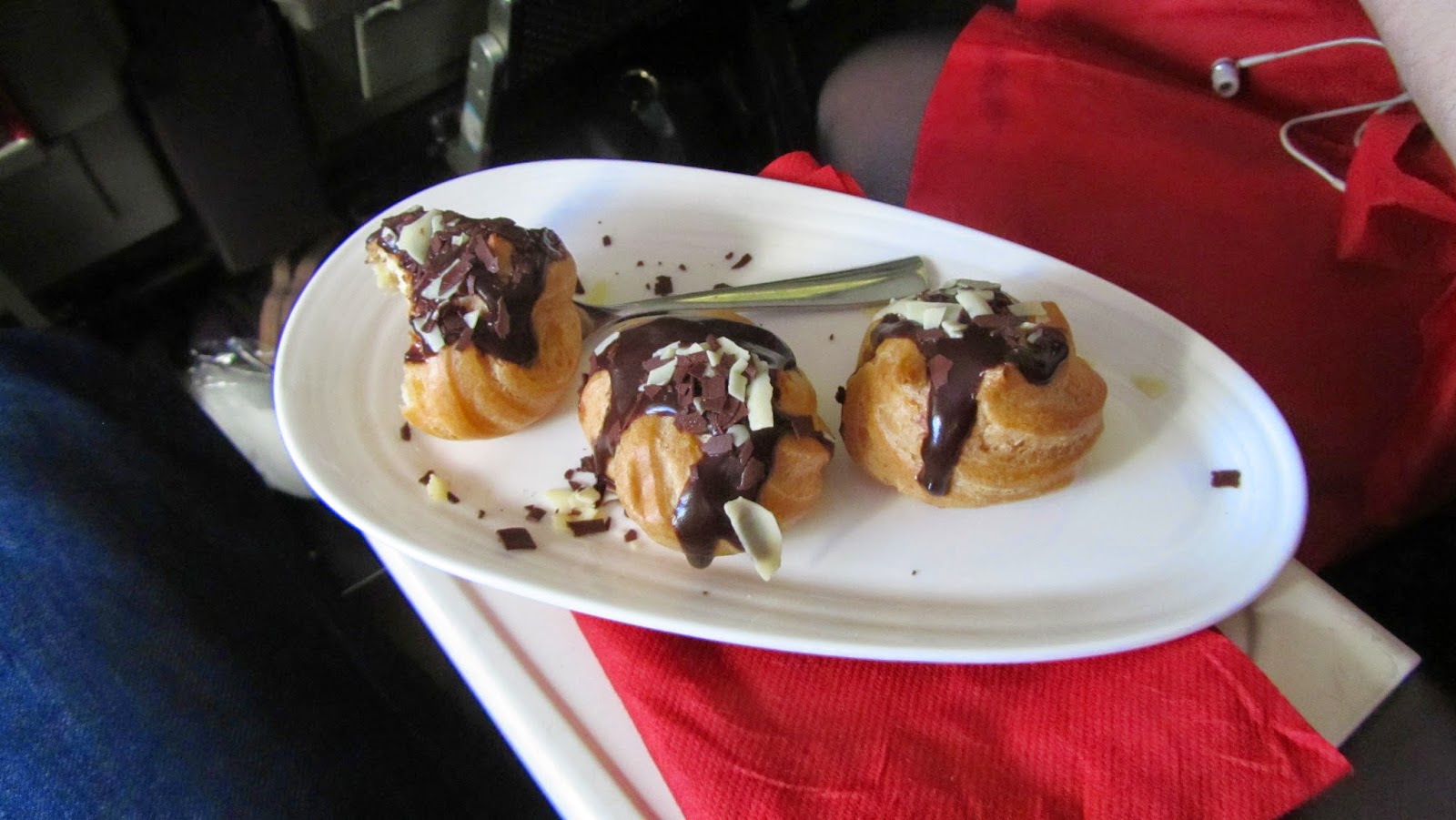And here is the obligatory food photographs! There was so much, and it was very nice. It was also followed with plenty of fizzy white wine that the flight attendant was giving us as we were on our honeymoon. We also had some delicious profiteroles from the First Class menu!